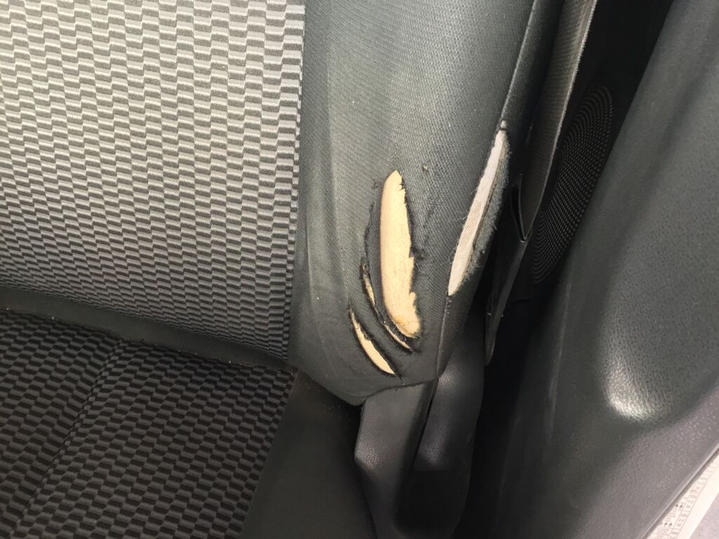 Asientos | Reparación | Asiento conductor roto. Asiento de pasajeros con quemadura de cigarro. Punto de anclaje de asiento trasero doblado | ||