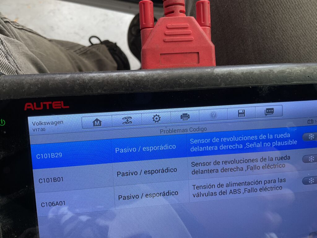 | Frenos | Mantenimiento | Sensor de revoluciones de rueda derecha y tensión de alimentación para válvulas del ABS, presentan fallo eléctrico. Se recomienda acudir con especialista | ||