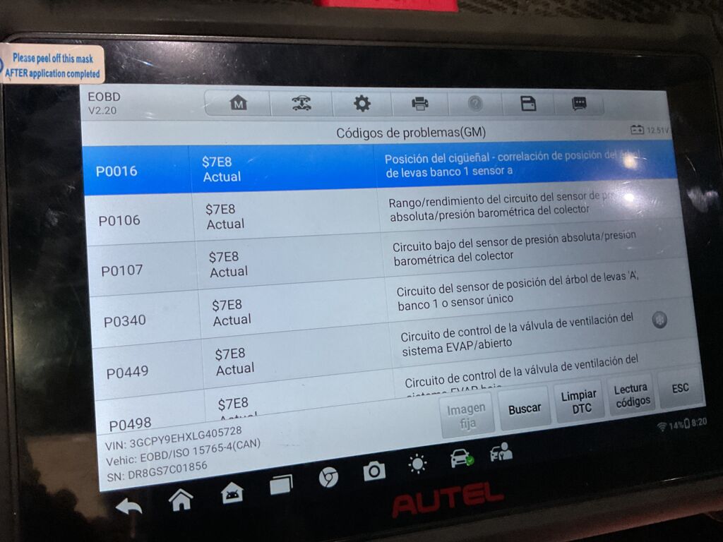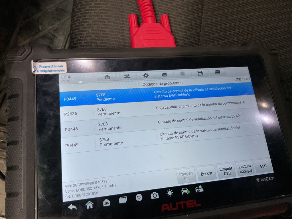 | Motor | Reparación | Check engine encendido diversos códigos de error, problemas con el sistema evap, sensor de cigüeñal, bomba de gasolina y sistema de encendido. (Códigos p0340, p0449, p2635) | ||
